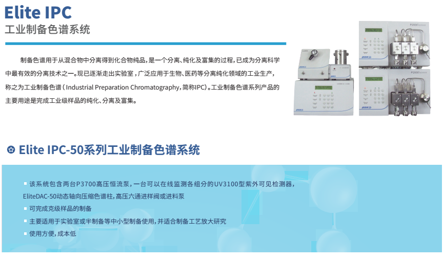 依利特科技的高壓半制備液相色譜系統(tǒng) EClassical3500/3700,巧妙融合了分析與半制備功能,為您打造一套完整的自動(dòng) HPLC 應(yīng)用方案,輕松應(yīng)對(duì)化合物的分析與制備需求。這套系統(tǒng)能讓分析與半制備之間的切換變得簡(jiǎn)單自如,樣品進(jìn)樣、餾分收集等工作也能有條不紊地完成。而依利特工業(yè)制備 Elite IPC 色譜系統(tǒng),從幾克級(jí)到十克級(jí)的樣品制備都能輕松勝任,無(wú)論是小型藥物研發(fā)團(tuán)隊(duì)還是大型純化實(shí)驗(yàn)室,都能在這里找到合適的選擇。?