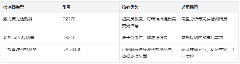 作為檢測(cè)信號(hào)的“捕捉者”,檢測(cè)器的性能直接決定了檢測(cè)結(jié)果的精準(zhǔn)度。依利特旗下的檢測(cè)器系列堪稱行業(yè)標(biāo)桿:D2370激光熒光檢測(cè)器,具備超高靈敏度,能精準(zhǔn)捕捉微弱熒光信號(hào),適用于痕量分析等高端檢測(cè)場(chǎng)景;D3210紫外-可見檢測(cè)器,波長(zhǎng)范圍廣、響應(yīng)速度快,滿足常規(guī)檢測(cè)的多樣化需求;DAD3100二極管陣列檢測(cè)器,可同時(shí)獲得多波長(zhǎng)檢測(cè)信號(hào),為復(fù)雜樣品分析提供更全面的數(shù)據(jù)支撐,無(wú)論是科研實(shí)驗(yàn)還是工業(yè)質(zhì)檢,都能輕松應(yīng)對(duì)。