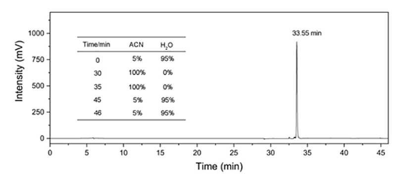 通過(guò)依利特EClassical 3140液相色譜儀搭配經(jīng)典SinoChrom ODS-BP色譜柱,對(duì)FmoccFFRRR肽的純度檢測(cè),結(jié)果顯示,F(xiàn)moccFFRRR肽的純度為97.3%。