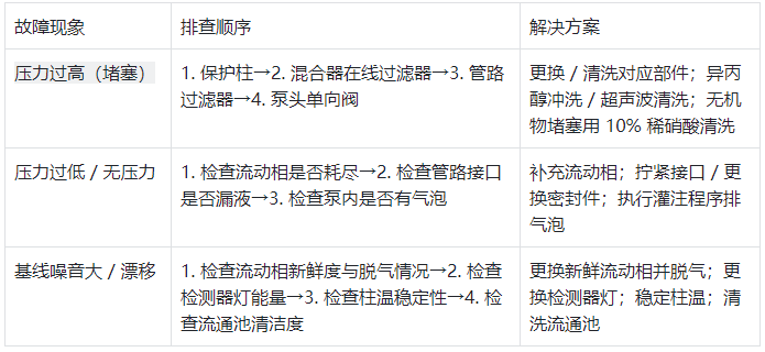 平時多注意預(yù)防,能少出很多故障。要是遇到壓力過高(大概率是堵塞了),可以按照這個順序檢查和清洗:先檢查保護(hù)柱,該換就換、該洗就洗;然后是混合器里的在線過濾器,拆下來清洗干凈;接著是管路過濾器,同樣檢查清洗;后是泵頭單向閥,要是堵了,用異丙醇沖洗,或者放超聲波里用異丙醇清洗,要是無機(jī)物堵塞,還能用 10% 的稀硝酸清洗。?