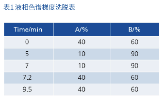 色譜柱:Quasar C18,100×2.1mm,3μm,貨號:N9308812(原文提及 “Supersil ODS2 2.1×100,3μm”,以實際檢測用 Quasar C18 柱為準);流動相:A 為 50% 甲醇水(含 0.5% 甲酸),B 為乙腈(含 0.5% 甲酸);柱溫:40℃;流速:0.5mL/min;進樣量:10μL;