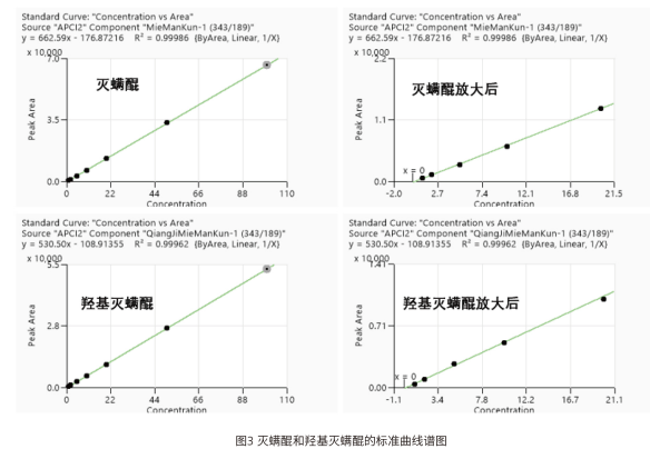 本文采用 EClassical 3200L-MS2 Vertical 9100 三重四極桿液質聯(lián)用系統(tǒng),建立了快速、高靈敏度且可靠的 LC-MS/MS 方法,用于測定食品中滅螨醌和羥基滅螨醌,為該類化合物提供了高通量檢測手段,檢出限完全滿足相關標準要求。滅螨醌:y=530.50x-108.91355,R2=0.99962;羥基滅螨醌:線性方程及 R2 詳見完整譜圖,R2≥0.999)