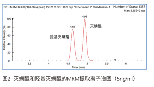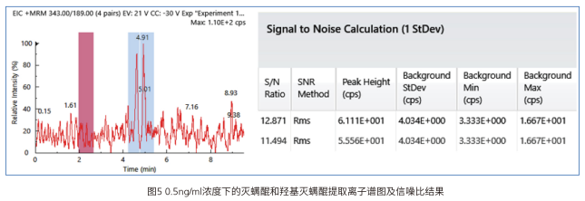 同時考察了該方法的儀器檢出限情況,在0.5ng/ml的濃度下,羥基滅螨醒和滅螨醒的的信噪比分別為11和12,如下圖所示,可見該方法靈敏度較高,完全滿足該標準的檢出要求。