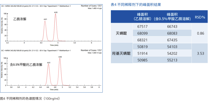 對比乙腈與含 0.5% 甲酸的乙腈溶液作為稀釋劑時的標準品響應(圖 4、表 4),結果顯示兩種稀釋劑對峰面積影響較?。珧?RSD=0.86%,羥基滅螨醌 RSD=3.53%),因此無需額外添加甲酸,兩種稀釋劑均可使用。
