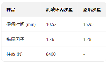 恩諾沙星保留時(shí)間 15.85min,拖尾因子 1.26,柱效(N)達(dá) 8500,分離效果與重復(fù)性?xún)?yōu)異。