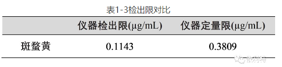 噪聲按0.04mV計(jì)算,峰高為3倍信噪比對(duì)應(yīng)的濃度為儀器檢出限,10倍信噪比對(duì)應(yīng)的濃度為儀器定量限,結(jié)果如下表所示。