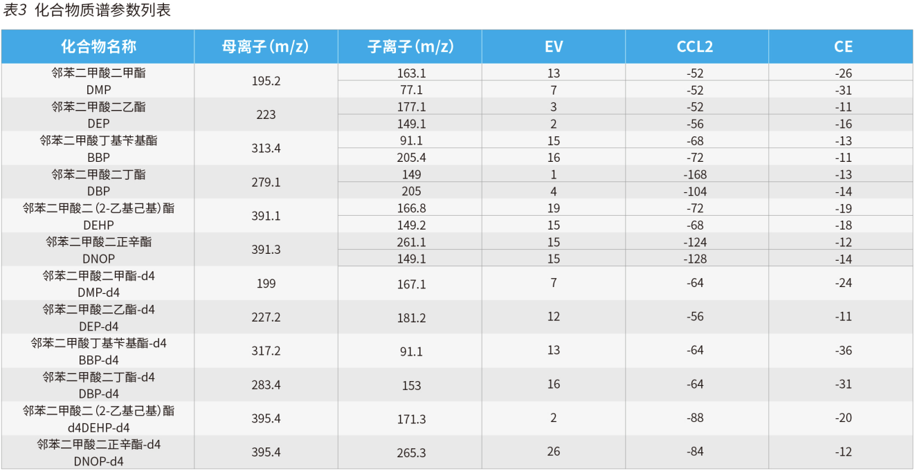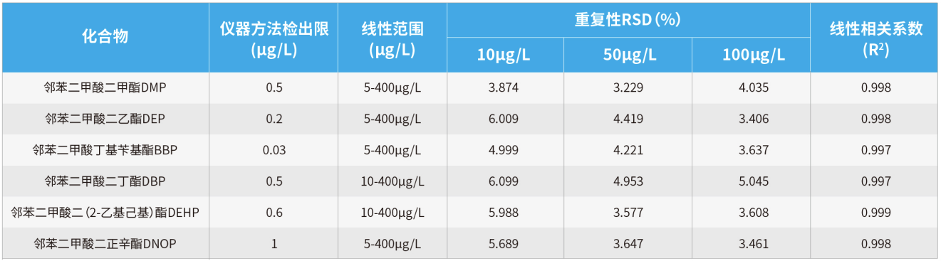 依利特 EClassical 3200L-MS2 Vertical 9100 液相質(zhì)譜聯(lián)用系統(tǒng),成功建立了水質(zhì)中 6 種鄰苯二甲酸酯類化合物的分析方案,根據(jù)保留時間及離子比率進行快速準(zhǔn)確定性,內(nèi)標(biāo)法定量,其檢出限完全滿足標(biāo)準(zhǔn)中的檢測限量要求,輕松應(yīng)對日常檢測分析要求。