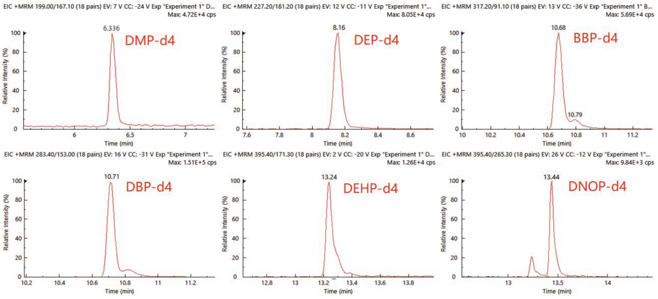 (圖 2 6 種鄰苯二甲酸酯類化合物及其內(nèi)標(biāo)的提取離子色譜圖(濃度為 100μg/L):包含 DMP、DEP、BBP、DBP、DEHP、DNOP 及其對應(yīng)內(nèi)標(biāo) DMP-d4、DEP-d4、BBP-d4、DBP-d4、DEHP-d4、DNOP-d4 的色譜圖,橫坐標(biāo)為時間(min),縱坐標(biāo)為響應(yīng)值相關(guān)參數(shù),圖中標(biāo)注了各化合物及內(nèi)標(biāo)的出峰時間,如 DMP 約 6.39min、DEP 約 8.19min、BBP 約 10.70min、DBP 約 10.732min、DEHP 約 13.25min、DNOP 約 13.51min 等,內(nèi)標(biāo)出峰時間與對應(yīng)化合物相近)