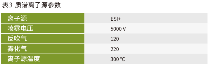采用 Elite MSVertical 9100 三重四極桿液質(zhì)聯(lián)用系統(tǒng)進行分析,離子源參數(shù)及目標化合物質(zhì)譜參數(shù)見表 2 和表 3。