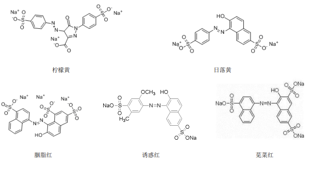 合成著色劑可分為偶氮類和非偶氮類兩種結構。在酸堿條件下,兩種結構的合成著色劑均穩(wěn)定。按著色劑的溶解性可分為脂溶性著色劑和水溶性著色劑,脂溶性著色劑由于不溶于水,在體內不易排出,毒性較大等原因,在食品行業(yè)已經不允許添加,現在世界各國使用的合成著色劑大部分為水溶性偶氮類著色劑。