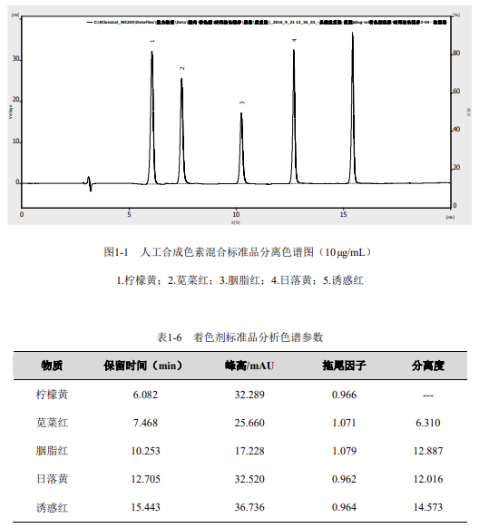 本實驗參考 GB/T 9695.6-2008《肉制品 胭脂紅著色劑測定》以及 GB2760-2014《食品安全國家標準 食品添加劑使用標準》,采用依利特公司生產的高效液相色譜儀,對著色劑標準品、線性以及加標回收率等進行檢測方法驗證,并且檢測實際肉制品中檸檬黃、胭脂紅、日落黃、莧菜紅、誘惑紅的添加情況。