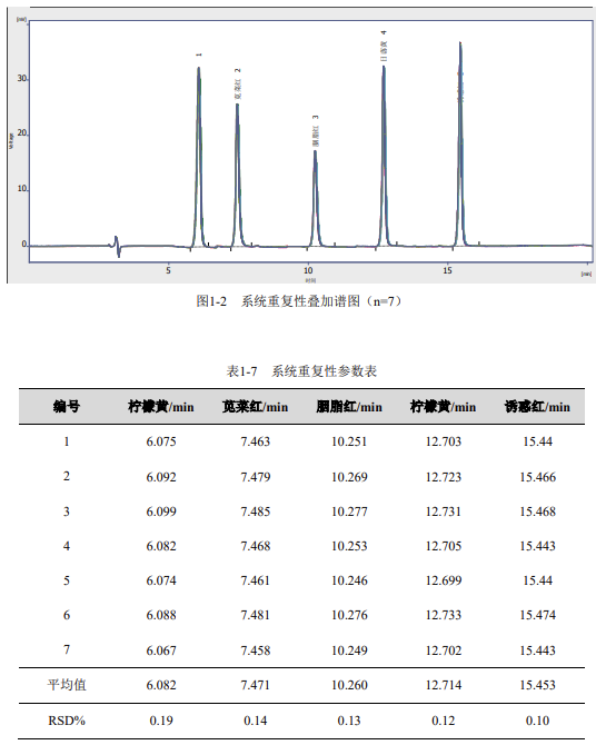 本系統的基線噪聲為 25μV,根據 3 倍信噪比,儀器的小檢出限分別為檸檬黃 20ng/mL,莧菜紅 22ng/mL,胭脂紅 33ng/mL,日落黃 20ng/mL,誘惑紅 17ng/mL。根據前處理方法計算,各目標物的方法檢出限分別為檸檬黃 12.5μg/kg,莧菜紅 13.8μg/kg,胭脂紅 20.6μg/kg,日落黃 12.5μg/kg,誘惑紅 10.6μg/kg。