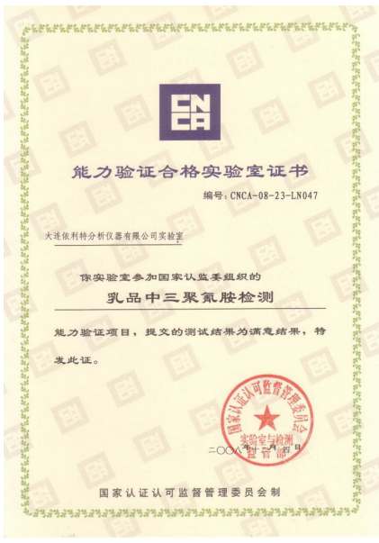 大連依利特分析儀器有限公司作為國內(nèi)知名廠家,秉承著 “質(zhì)量更佳、服務(wù)更優(yōu)、創(chuàng)新更快” 的理念,二十年來為食品安全、藥品檢測及高校應(yīng)用等眾多行業(yè)提供著完善的分析方法及先進的儀器配置。從蘇丹紅、孔雀石綠到 “三鹿奶粉三聚氰胺” 事件,關(guān)系著國計民生的 “食品安全” 問題一次次為我們敲響警鐘,并引起社會廣泛關(guān)注。針對 “三聚氰胺” 事件,依利特人在第一時間做出反應(yīng),榮獲由國家認證認可監(jiān)督管理委員會頒發(fā)的 “能力驗證合格實驗室證書”,并且按照 GB/T 22388-2008《原料乳與乳制品中三聚氰胺檢測方法》、GB/T 22400-2008《原料乳中三聚氰胺快速檢測 液相色譜法》的國家標準,在經(jīng)過大量實驗驗證后,提供出符合國標的三聚氰胺檢測解決方案,包括分析方法驗證及推薦儀器配置在內(nèi)的全套解決方案。