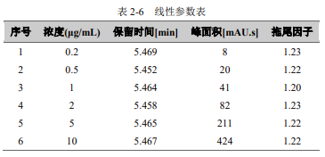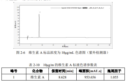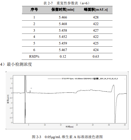 重復(fù)性:用濃度為 10μg/mL 維生素 A 標(biāo)準(zhǔn)溶液,連續(xù)進(jìn)樣 6 針,峰面積和保留時(shí)間 RSD 結(jié)果如下: