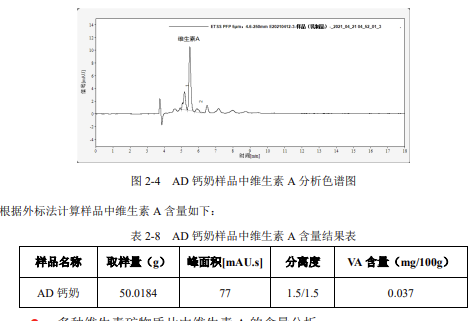 該色譜條件下,儀器的基線噪音為 0.0302mAU,根據(jù)信噪比S/N=3,計(jì)算得到維生素 A 的儀器小檢測(cè)濃度為 0.017μg/mL,實(shí)際方法檢出限為 3.5μg/100g,比國(guó)標(biāo)的方法檢出限 10μg/100g,靈敏度高了不少。實(shí)際樣品分析AD 鈣奶樣品中維生素 A 的含量分析
