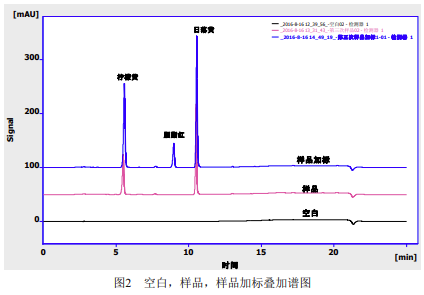 本系統(tǒng)的基線噪聲為25μV,根據(jù)3倍信噪比,儀器的小檢出限分別為檸檬黃20ng/mL,胭脂紅25ng/mL,日落黃18ng/mL。根據(jù)前處理方法計(jì)算,各目標(biāo)物的方法檢出限分別為檸檬黃20μg/kg,胭脂紅25μg/kg,日落黃18μg/kg,參見表7。