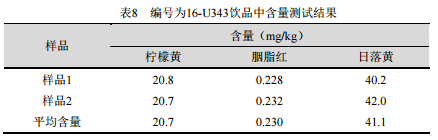 按照上述方法分析中國檢驗(yàn)檢疫科學(xué)研究院測試評價(jià)中心提供的飲品(樣品編號16-U343),測試含量結(jié)果見表8。