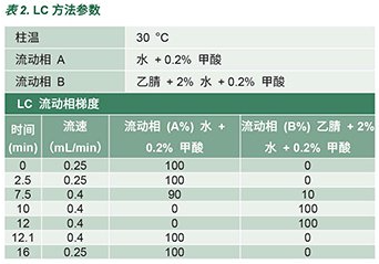 LC 參數(shù):柱溫 30℃;流動相 A 為 “水 + 0.2% 甲酸”,流動相 B 為 “乙腈 + 2% 水 + 0.2% 甲酸”;梯度洗脫程序按時間調(diào)整流速與 A/B 比例(詳見表 2);