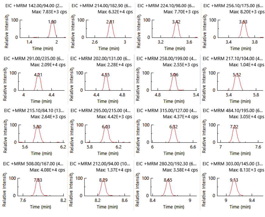 本方法采用一針進(jìn)樣,通過Time Managed MRM正負(fù)切換模式同時(shí)測定331種化合物及其45種代謝物,共375個(gè)化合物,其中365種化合物采用正離子模式采集,10種化合物采用負(fù)離子模式采集。圖1中展示了375種化合物的提取離子疊加譜圖,圖2中是單獨(dú)10個(gè)負(fù)離子化合物的提取離子色譜圖。經(jīng)過優(yōu)化色譜洗脫條件,圖3展示了不同保留時(shí)間的部分農(nóng)藥化合物的提取離子色譜圖。各個(gè)化合物峰型對稱,軟件中TimedMRM功能目動完成375個(gè)化合物的軒留時(shí)間分配,保讓每個(gè)色語峰上有足夠的來集點(diǎn)教,以使獲得準(zhǔn)確的結(jié)果為優(yōu)異的重復(fù)性,不同流出時(shí)間的代表性化合物的色譜圖采集點(diǎn)數(shù)情況示例詳見圖4。