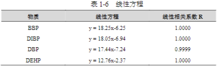 由表 1-6 可知,按照本解決方案提供的儀器及檢測方法進行分析,DEHP、DBP、BBP、DIBP 在濃度 1μg/mL~100μg/mL 濃度范圍內(nèi),線性相關性良好。
