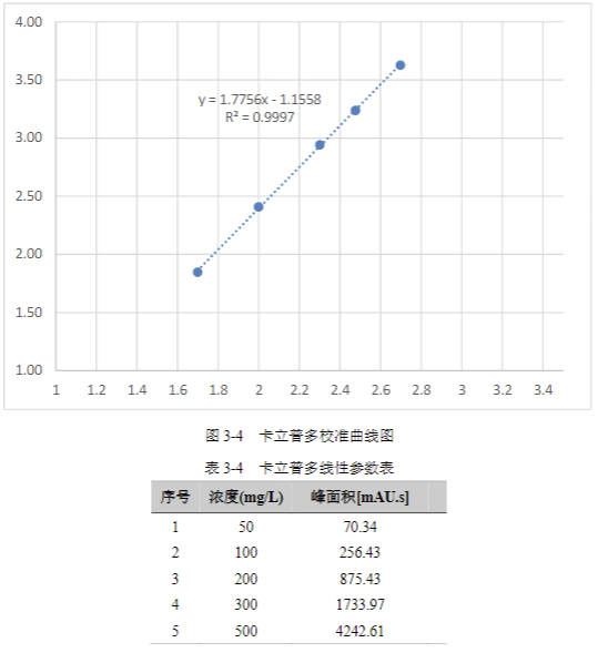 卡立普多 線性方程為 y = 1.7756x - 1.1558 R2 = 0.9997。 因此, 卡立普多 在 50~500 mg/L濃