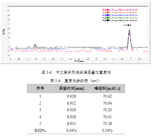 濃度為50 mg/L卡立普多 標準溶液,連續(xù)進樣 5針,峰面積和保留時間 RSD結果如下:
