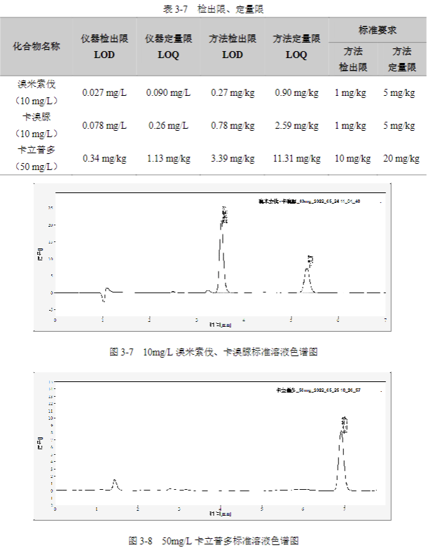 根據公式計算溴米索伐、卡溴脲儀器檢出限、定量限和方法檢出限、定量限,結果如下: