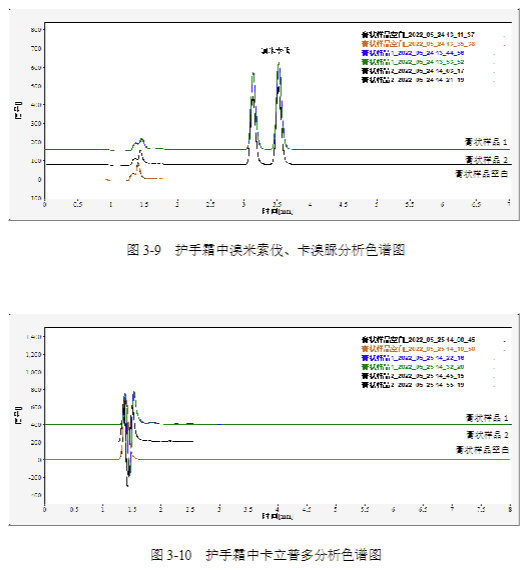 高清資料:圖 3-1 至 3-10 高清色譜圖(含峰型放大細節(jié))、護手霜樣品加標譜圖;