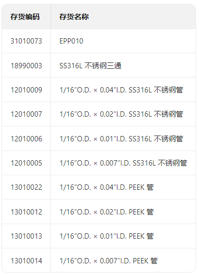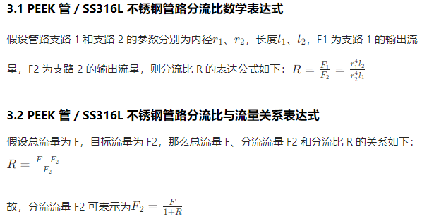 通過 PEEK 管 / SS316L 不銹鋼管路分流比數(shù)學表達式計算,可選取內(nèi)徑為 0.04”I.D.、長為 256mm 的 PEEK 管作為支路 1;內(nèi)徑為 0.01”I.D.、長為 999mm 的 PEEK 管作為支路 2,則支路 2 的流量即為 1μL/min。
