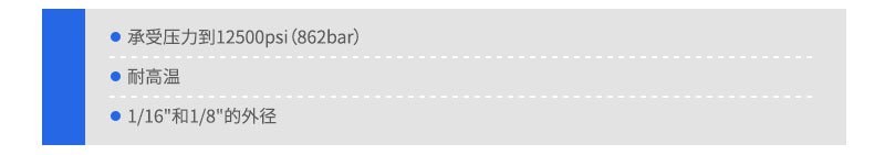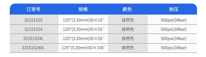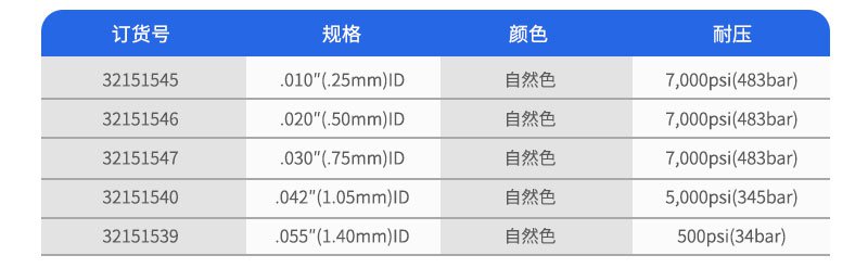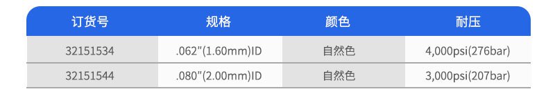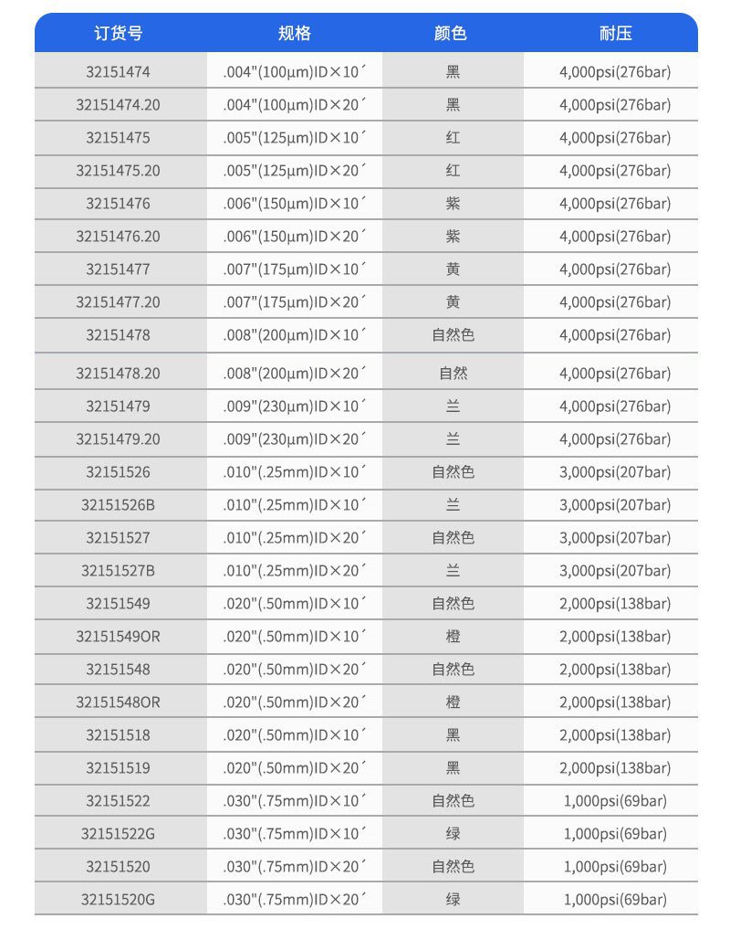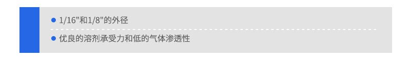 該種管有1/16"和1/8"外徑兩種規(guī)格,外徑和內(nèi)徑的公差分別為±0.001"和±0.003"。這種聚合物材料在100℃操作溫度下不會降低其機械強度。
