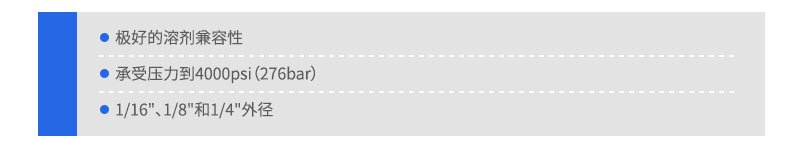 與傳統(tǒng)熔融石英毛細管一樣,與不銹鋼連接管相比,PEEKSIL管有極好的化學相容性和極低的特異性吸附,這種PEEK熔融石英組合管高可承受15000psi壓力。